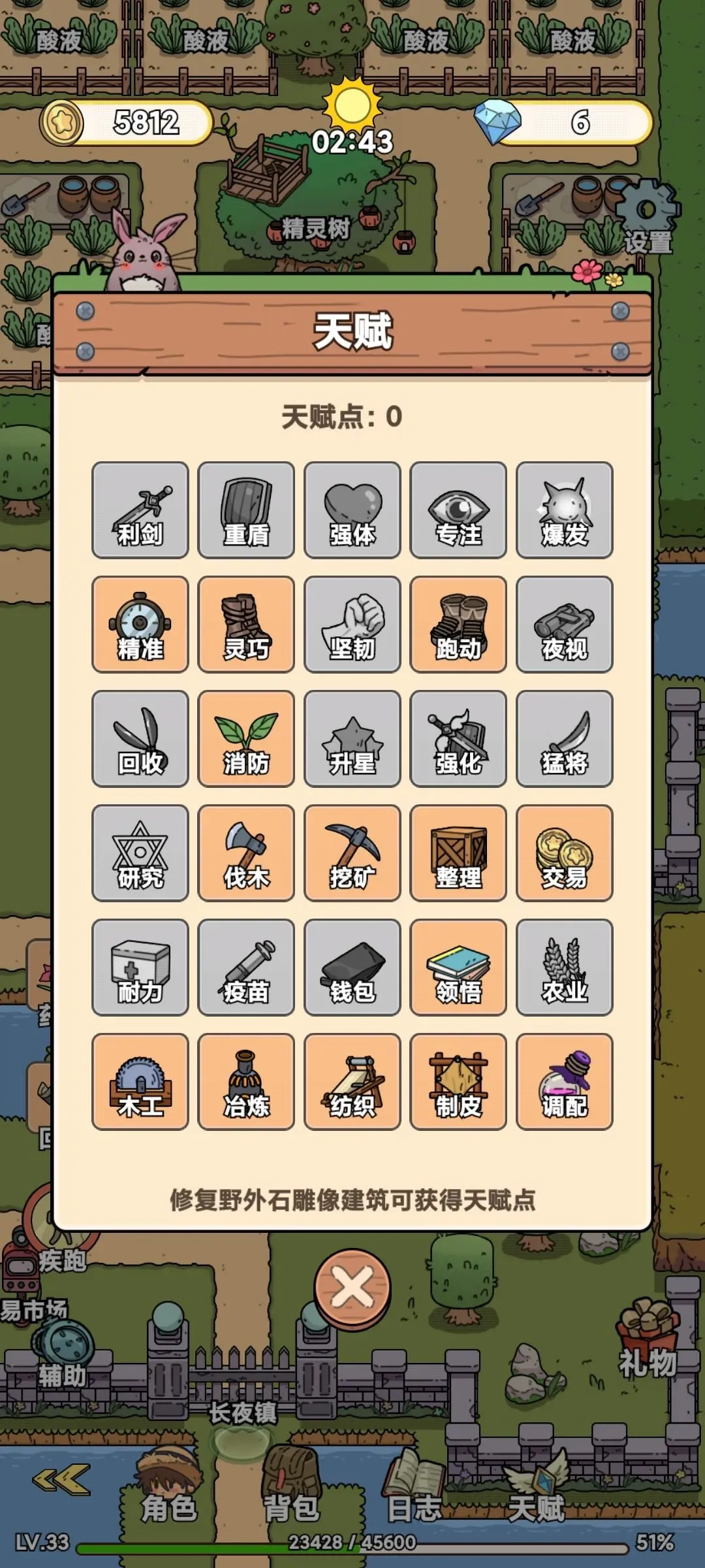 天赋加点:通过修复野外石像获取点数,修复完以后是不会显示石像名的,具体修复材料可通过日志点击查看。优先加点最后一排和第四排,可节约木材基础资源,减少金币消耗等。个人加点如图。