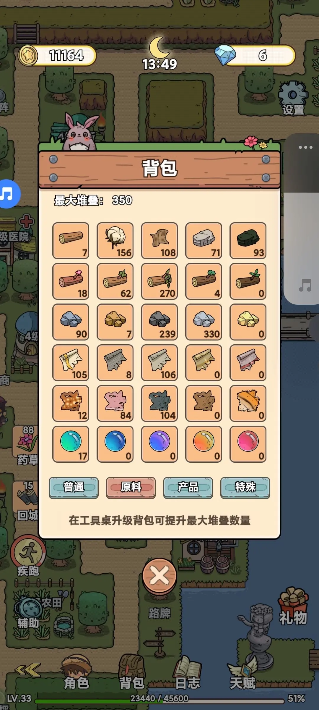 背包可通过工具桌升级。打开背包后,左上角会显示物品的最大数量限制。例如,若你通过观看广告已将背包内木头的数量刷至上限,那么后续获得的奖励将只有金币和经验,不再出现木头。