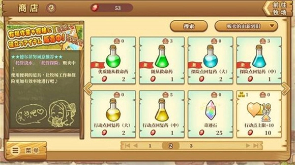 行动力与探险点:行动力和仓库问题一样让人头疼,总是不够用。游戏前期会给不少补充行动力的瓶子,到了后期掉落数量就变少了,通常只有完成个别任务或者连续探索三个宝箱后才会获得,这些任务和宝箱给的一般都是加10点的小瓶;大瓶则需要去商店购买,看似价格不贵,但实际用起来消耗得很快,不建议大家用石头购买,石头最好还是攒着用来扩充仓库和解锁土地!