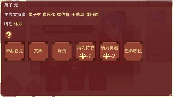 确定要进行妃位变动吗?这会带来以下影响:中书令崔子玄忠诚值增加14,乐苍州刺史夫人崔华似忠诚值增加4,左散骑常侍崔卿恽忠诚值增加4。若确认,请点击“是”。