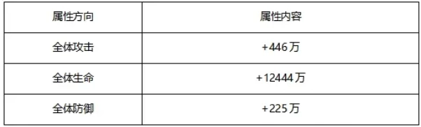基础增益情况如下:生命值为7200万,攻击力达480万,物理防御和法术防御均为348万,同时全属性提升10%。