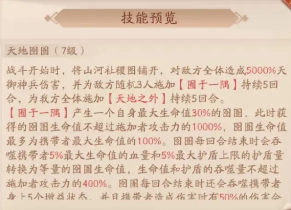 战斗开启的瞬间,展开山河社稷图,对敌方所有单位造成相当于天御神兵伤害5000%的攻击,同时随机选取敌方3人附加【囿于一隅】状态,该状态将持续5个回合;此外,为我方全体成员施加【天地之外】状态,效果同样持续5个回合。