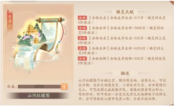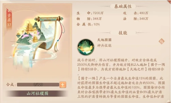神兵山河社稷图的设计独具匠心,其资质设定与女娲补天相同,均遵循天金+资质的标准。接下来为大家解读这款最新天金神兵的技能详情。