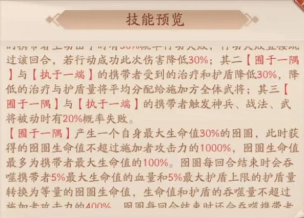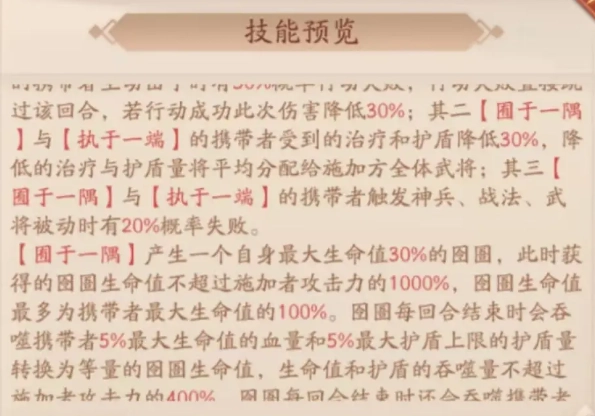 当携带者主动发起攻击时,会额外对敌方所有带有【囿于一隅】或【执于一端】状态的武将,造成相当于天御神兵伤害3000%的伤害。若敌方阵营中存在尚未获得【囿于一隅】和【执于一端】状态的武将,则从剩余武将里随机选取1人,为其施加持续3回合的【囿于一隅】状态。 对于已拥有【囿于一隅】状态的武将,将随机强化其囹圄效果:第一种强化是囹圄的生命值增加携带者当前生命值的20%;第二种强化是在3回合内,每当敌方的红颜、军师、神兽行动时,【囿于一隅】状态对应的囹圄生命值会增加当前数值的30%。 同时,会为山河社稷图随机添加以下一种细节效果: 其一,带有【囿于一隅】或【执于一端】状态的武将主动出手时,有30%的概率行动失败,行动失败将直接跳过该回合;若行动成功,则此次造成的伤害降低30%。 其二,带有【囿于一隅】或【执于一端】状态的武将所受到的治疗和护盾效果降低30%,而降低的治疗量与护盾量会平均分配给施加该状态的一方全体武将。 其三,带有【囿于一隅】或【执于一端】状态的武将触发神兵、战法或武将被动效果时,有20%的概率触发失败。