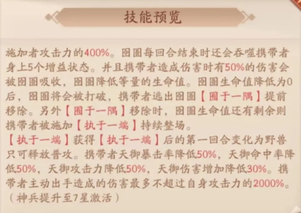 在获得【执于一端】效果后的首个回合中,所有野兽仅能进行普通攻击。同时,该效果的携带者其天御暴击率、天御命中率、天御攻击力均会降低50%,天御伤害增加幅度减少30%;此外,携带者主动出手时造成的伤害上限为自身攻击力的2000%。