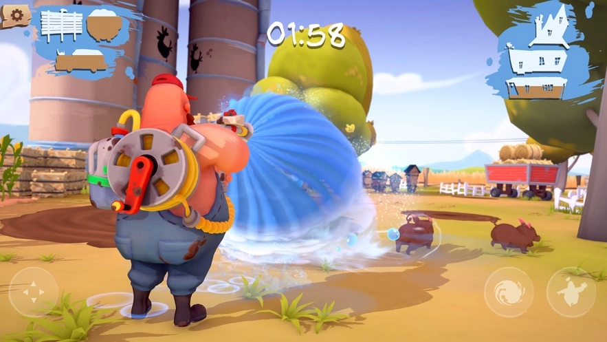 小猪的任务:让小猪们在泥地里打滚,把泥巴沾满全身,接着把泥巴甩到农场里的各类东西上,像房屋、拖拉机、广告牌之类的,还能往农场工人身上甩泥巴。