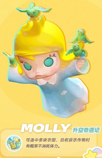 1,游戏原汁原味还原了 Molly、Tycoco 等泡泡玛特高人气潮玩角色,陪伴玩家体验种植、建造等丰富玩法