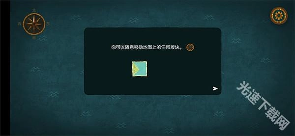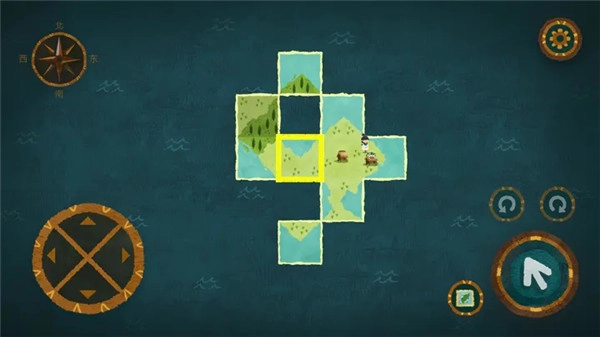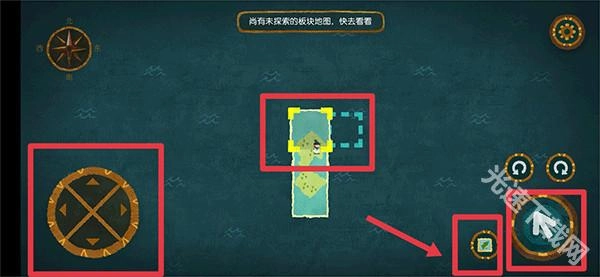 用黄色边框框选需要移动的地图,点击箭头确认选中后,通过左侧轮盘操控地图移动;待地图摆放至合适位置,点击地图按钮就能进入地图开始探索。