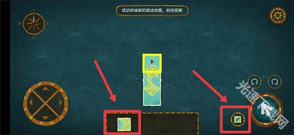 在探索区域获取新地图后,点击地图图标进入地图界面,接着选择新地图版块完成拼接操作。