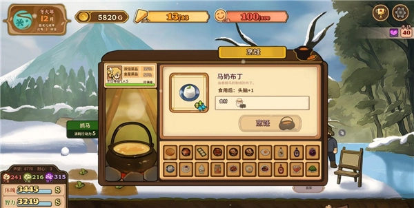 通常我们不会制作加智力属性的食物,毕竟继承自带的50点智力,再加上课程能提供的智力值,其实已经完全够用了——100点智力足以让你在火山国“精神上横着走”;之前提过战斗副本3能产出大量食材,最终可以实现零消耗刷副本,配合天赋甚至能做到一回合拥有三回合的行动力。所以我们得尽快提升力量,达到能刷第三副本的水平。因此前期要多种植小麦,多捕捉中级马(每回合能产3份马奶的那种):4份马奶用来做马奶酒,剩下的零头就用来做葡萄奶昔——原来葡萄一直是“备胎”食材啊。
