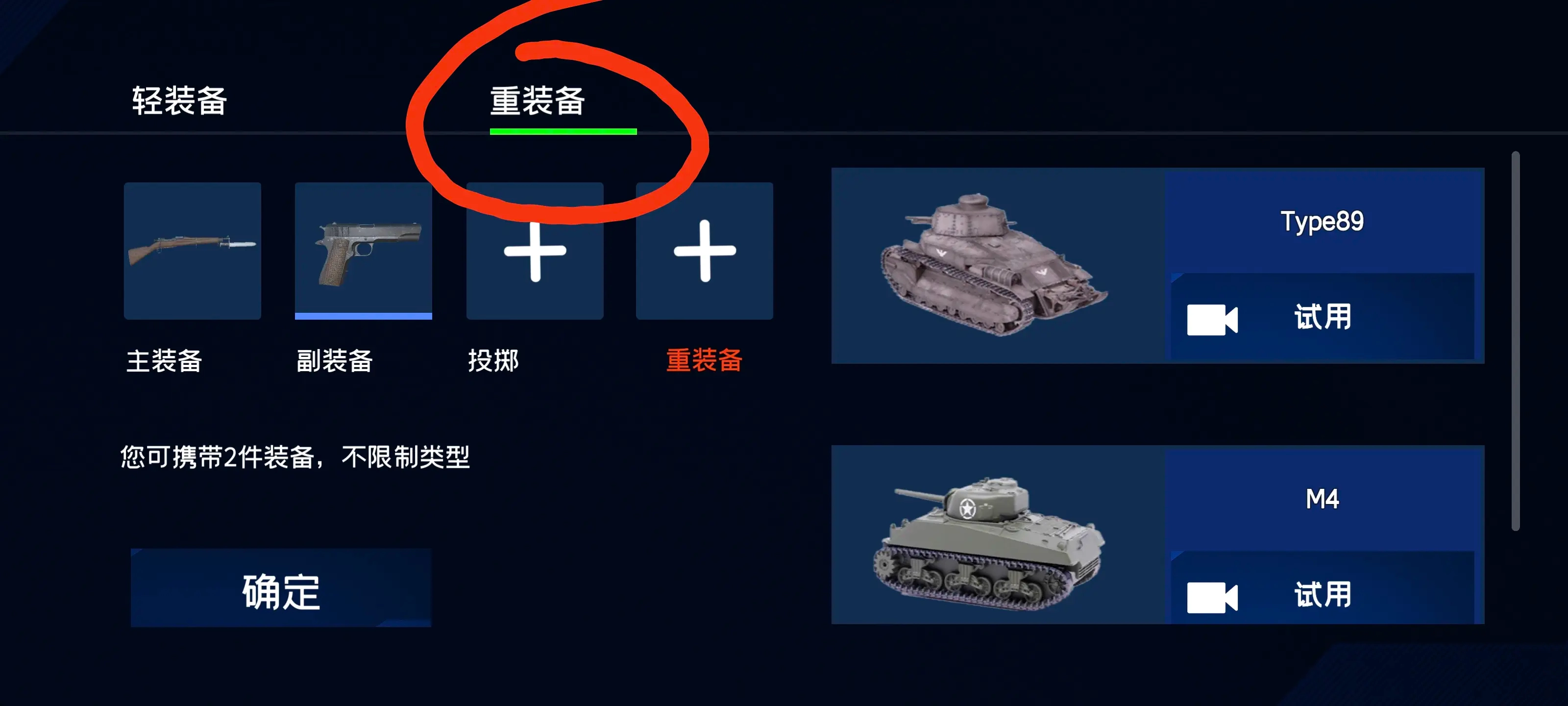 获取坦克的方式如下:进入装备选择界面后,找到并点击“重装备”选项,此时游戏场景中会出现一辆静止的坦克,靠近并乘坐上去就能开始驾驶了。