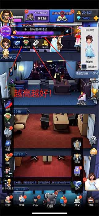 公务、粉丝探班和会议都能提升观众对电影的期待值。其中,公务的期待值点数依据玩家所在档区与等级来确定,玩家等级还会决定是否能获得公务奖励——等级越高,可参与的公务次数就越多,每次公务能奖励4到6点期待值。以100级左右的公司为例,其一次性可积攒的公务上限约为40件,如此一来,处理这些公务保底能获得160点关注点数。