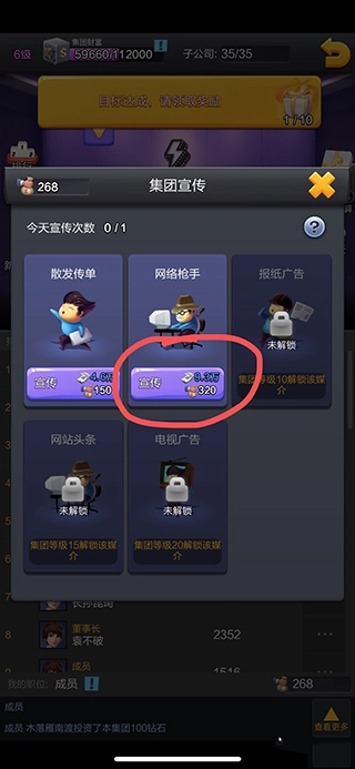 玩家加入集团并对集团进行投资后,还能通过消耗钞票和贡献值来换取集团宣传,这样至少可以获得三十点关注点数。