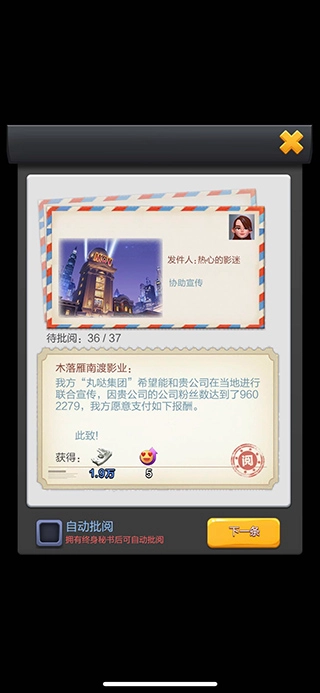 周边订单业务同样能提升电影的期待值,玩家各自拥有生产周边产品的工厂,产品的种类、数量以及生产所需时间,均由玩家商务部的等级来决定。这些订单的来源正是电影的宣传与放映环节,完成订单业务还能让玩家获取电影的关注点数,点数根据订单等级有所差异,最低也有五个。