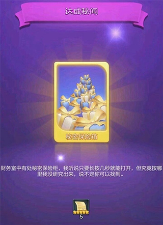 游戏内“隐秘保险箱”的解锁方法:长按财务室的美元标记按钮持续四秒,游戏界面会出现保险柜展开的动画并显示四秒的时间提示。