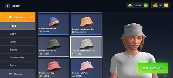 点击左侧的Clothes,可以购买头饰、衣服、裤子、鞋子以及武器等装备。
