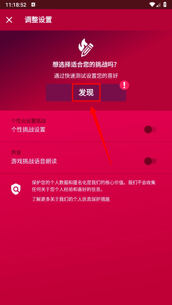 如图所示,点击“发现”按钮进入页面,借助快速测试来设置您的偏好。