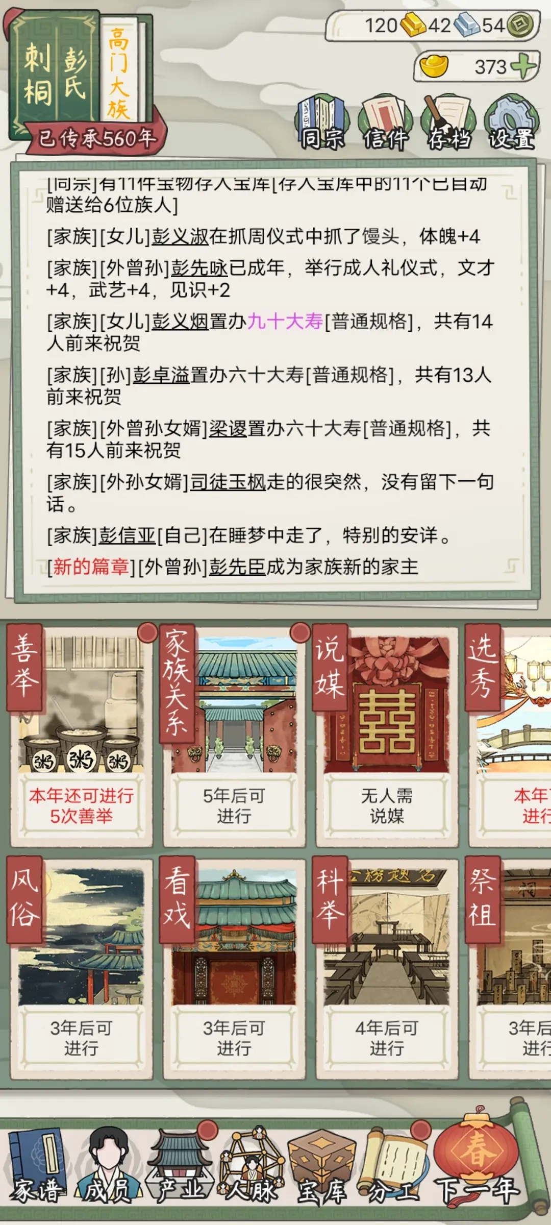 开局一定要选随自己姓和生子嗣+3元宝的选项,不然后面很容易断代。