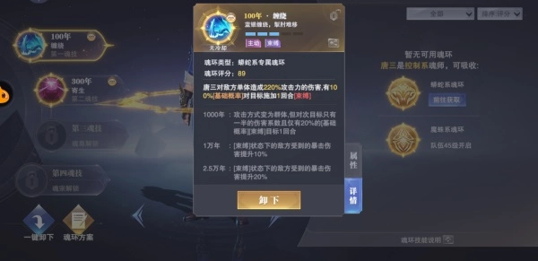 佩戴不同年份的魂环,会让魂技效果产生质的变化(需结合魂师星级)。拿唐三的第一魂技【缠绕】来说,要是只吸收千年以下的魂环,这个魂技就只是单体攻击,只能给一名敌方角色加上【束缚】状态;可一旦吸收了千年魂环,第一魂技就会从单体技能变成群体控制技能,在造成高额伤害的同时,还有概率对敌方全体角色施加【束缚】状态,这也让唐三直接成为《斗罗大陆:魂师对决》里最顶尖的控场魂师。