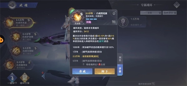 同时,魂环自身也可进行一定程度的强化,强化后的魂环能提升相应的伤害与防御力。值得注意的是,当魂师所佩戴魂环的总强化层数达到特定标准时,还会额外增加一定的【高级伤害】和【防御】属性。