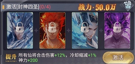 提升:全体仙将合击伤害增加12%,冷却时间缩减1%,神力提升200点。