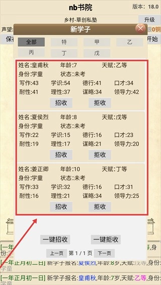 游戏开始时,玩家要招募弟子。每年春天,会有学生前来学院求学,玩家需依据自身的天赋等级,结合写作、知识、口才、策略等各项能力的评分来挑选合适的学生。