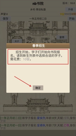 春季招生阶段,系统会提示需要花费【10银】,点击【确定】按钮就能进入新生选择界面。