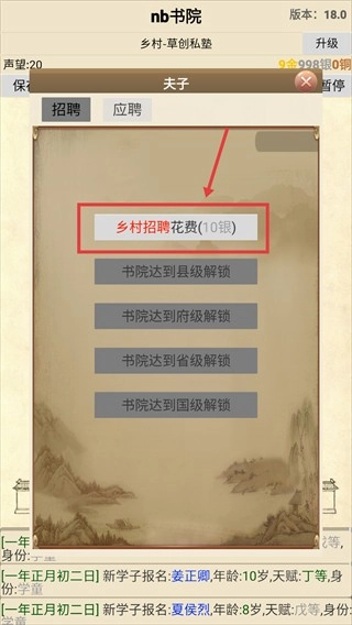 在夫子招聘界面中,选择乡村级别的招聘需要消耗【10银】;而县级及以上级别的招聘选项,则需要书院完成升级后才能解锁使用。