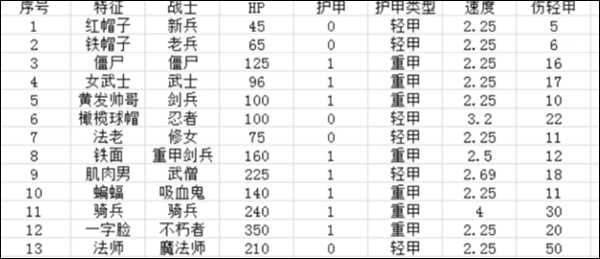 新兵、老兵、僵尸、武士、剑兵、忍者、修女、重甲剑兵、武斗家、吸血鬼、骑兵、不朽者、魔法师、铁面骑士、恐惧魔王、大领主。