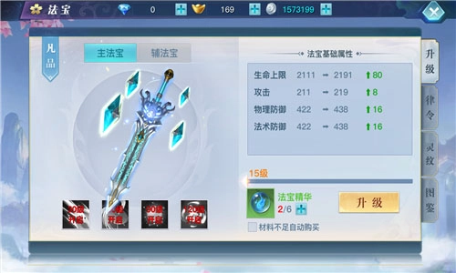 法宝强化主要有三大途径,分别是升级、律令和灵纹。升级即提升法宝等级,等级越高,战力加成越高。另外,玩家可以使用律令刷新法宝属性,每天有5次刷新法宝属性值的机会,每次刷出的属性高低也会影响战力增加的幅度。最后,玩家还能通过使用灵纹符来提升法宝属性,灵纹等级越高,战力增加得就越多。