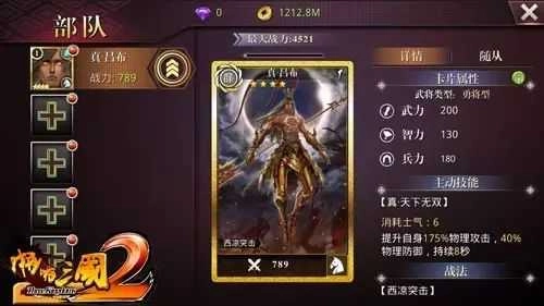 从真·吕布进阶为鬼·吕布后,其武力、智力与兵力属性迎来新一轮大幅增长,主动技能“鬼·天下无双”将为自身带来225%的物理攻击加成以及50%的物理防御加成。