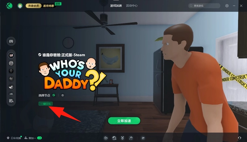 另外,还可以借助加速器来实现一键汉化:在迅游加速《谁是你爸爸》的界面上,能找到“一键汉化”的工具按钮,点击该按钮进入相关流程。完成汉化操作后,按照提示完成汉化设置的步骤。随后启动《谁是你爸爸》,就会发现游戏界面已经变成中文了。