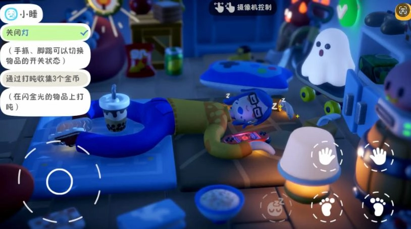 在布景后方查看事件卡片,借助趴行时的惯性把物品推到规定位置,完成任务就能去睡觉了。