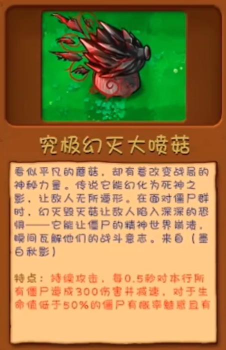 究极幻灭大喷菇看似是不起眼的蘑菇,实则蕴藏着足以扭转战局的神秘力量。相传它能化身为死神之影,令敌人无处遁形。在对抗僵尸群时,其释放的幻灭毁灭萜能让僵尸陷入极度恐惧——不仅会摧毁它们的精神世界,还能瞬间瓦解战斗意志。它的特点是持续攻击,每0.5秒对本行所有僵尸造成300点伤害并附带减速效果;对于生命值低于50%的僵尸,还有概率触发魅惑效果……