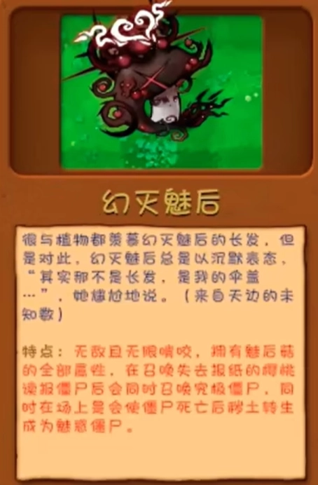 特点:具备无敌特性与无限啃咬能力,拥有魅后转机制,在召唤失去报纸的博桃读报?导时会同步召唤究极僵尸,当两者同时在场时,僵尸死亡后将通过秽土转生变为魅惑僵尸。
