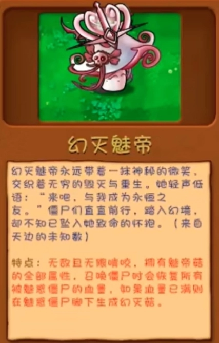 幻灭魅帝始终带着一抹神秘的笑意,其中交织着无尽的毁灭与重生之力。她柔声呢喃:“来吧,与我缔结永恒的羁绊。”僵尸们径直前行,步入幻境却未察觉已落入她致命的罗网。特性:处于无敌状态且能无限啃咬,具备魅帝菇的所有属性;召唤僵尸时,会为所有被魅惑的僵尸恢复全部血量,若血量已满,则在被魅惑僵尸的脚下生成幻灭菇。