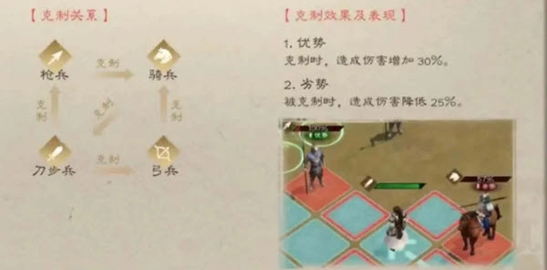 枪兵与弓兵能克制骑兵,骑兵则克制步兵,而步兵又克制枪兵和弓兵,三者构成了一个三角循环的克制关系(这是新手需要留意的要点)。