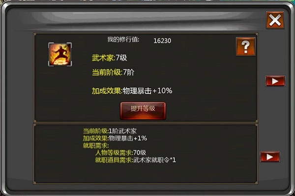已满足副职业等级提升条件的侠士,可在界面中选定已就职的副职业,随后点击“提升等级”按钮完成操作,副职业每次升级均会消耗相应数量的修行值。