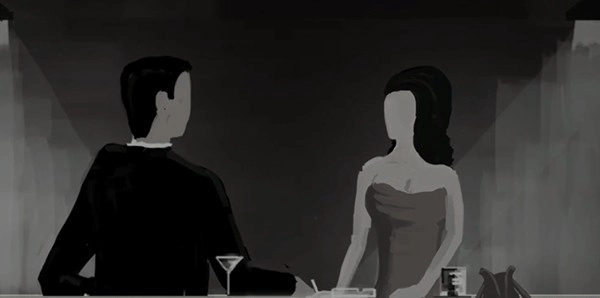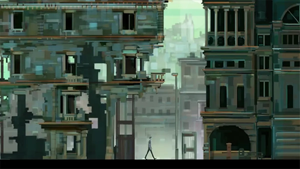 下楼后一直往右走,又遇到一个楼梯,走上楼梯便到了大桥。沿着大桥继续往右走,来到一家电影院。电影院内部同样破旧不堪。点击时钟,能看到男女主角相拥亲吻,荧幕上的情侣也在跳舞;点击荧幕,荧幕里的情侣跳着跳着也亲吻起来。