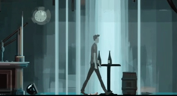 下楼后,往右侧走去,来到一家酒吧。推门进入,在桌上发现了一包烟,里面依旧只有三根。在此期间,点击右上角的时钟,能看到酒吧也已破损不堪(推测这里可能在拆迁)。随后径直往右走,来到桌子附近,点击左上角的时钟,场景随即发生变化。将酒吧里的3瓶酒喝完后,男主便醉了,眼前浮现出一些酒瓶和躺着的人的图案。