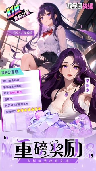 高校里排名第一的高冷学姐,宛如高傲的冰霜女王。她拥有强大的全体攻击能力,能给敌人附加随机的控制或减益效果,堪称最强控场!