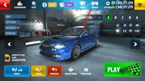 首先启动游戏,进入顶级漂移PRO解锁车辆版的主界面,然后点击右上角的(garage)图标。
