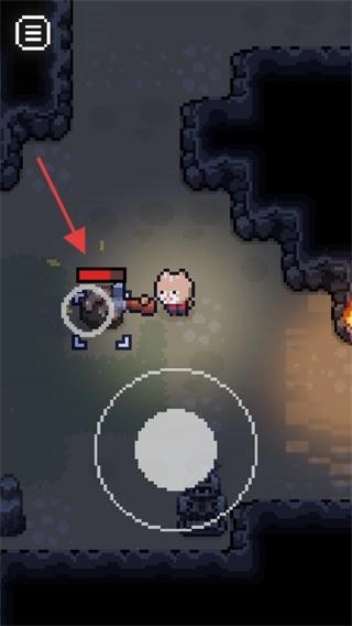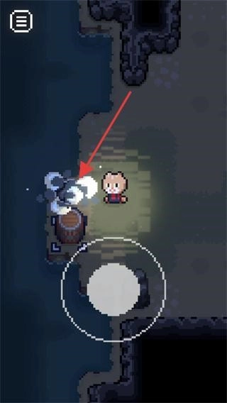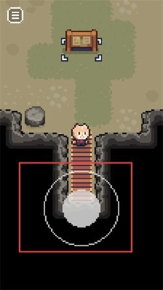 在像素风格的探索场景里,你需要操控角色移动到红色框标注的【白色圆形】操作区域,接着沿着楼梯向下探索,这样就能开启洞穴的探索流程了。