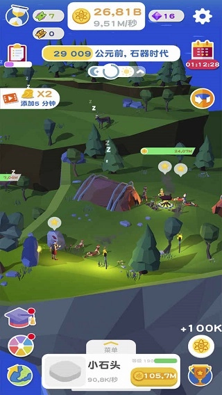处于【公元前39982年·石器时代】阶段时,点击右下角的原子图标来获取资源,与此同时点击“小石头”右侧的【打开】按钮,以此开启它每秒3.26的资源生产功能。