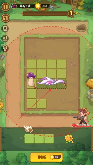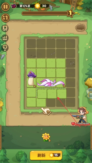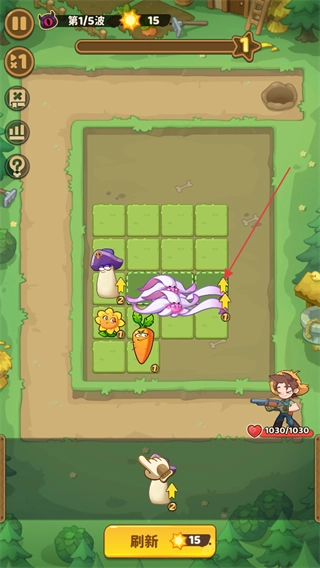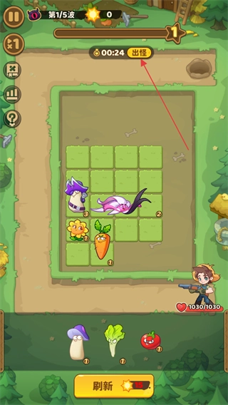 在补充部署阶段,消耗太阳来刷新下方的列表,把新刷新出的胡萝卜等战斗单位安排到网格的空位上,以此提高对敌人的拦截能力和输出效率。