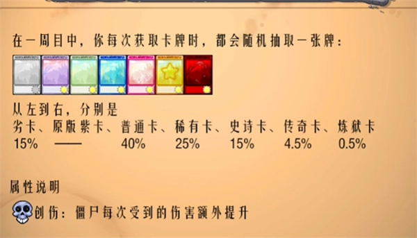 在一周目里,每当你获得卡牌时,都会随机抽选一张:按从左至右的顺序,对应的概率分别是劣卡15%、原版紫卡、普通卡40%、稀有卡25%、史诗卡15%、传奇卡4.5%、炼狱卡0.5%