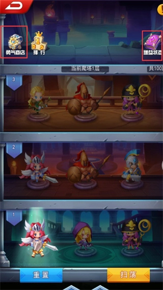 游戏里装备的主要获取途径当属试炼之塔。试炼之塔每层设有3个boss,每个boss都提供3种难度选项,挑战并击败对应难度的boss就能得到相应数量的星星,这些星星可用于每层通关后挑选buff。击败boss还能获取勇气币,而且每通关5层就能获得一个宝箱,首次开启宝箱会产出完整装备;之后每天有1次免费重置试炼之塔的机会,重置后再开宝箱,玩家将得到随机的武器碎片。界面右上角是勇气商店,左上角则能查看已获得的所有增益效果。