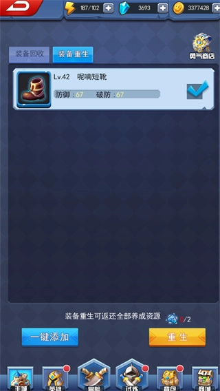 装备回收功能支持玩家回收装备,完成回收操作后,玩家将获得对应的金币与勇气币奖励。此外,装备重生系统能够让玩家通过消耗装备重生石,对已培养的装备进行回收处理,并且该操作会全额返还装备养成过程中投入的所有资源。