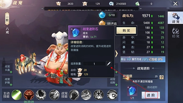 战宠升阶需消耗战宠进阶石,使用后可增加进阶祝福值,祝福值越高,进阶成功率相应提升。前四阶战宠的祝福值不会衰减,而第5阶及以上的祝福值,会在每日5:00衰减至当前数值的70%,因此建议积攒足够多的材料后再进行进阶,避免造成材料浪费。战宠进阶成功后,不仅能大幅提升属性加成,还会解锁全新的战宠外观。