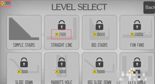 关卡页面的情况如图所示,除了第一关之外,其余关卡都需要积累足够的金币方可解锁。我们可以通过重复游玩第一关来获取金币,待金币数量达标后,就能解锁第二关了。